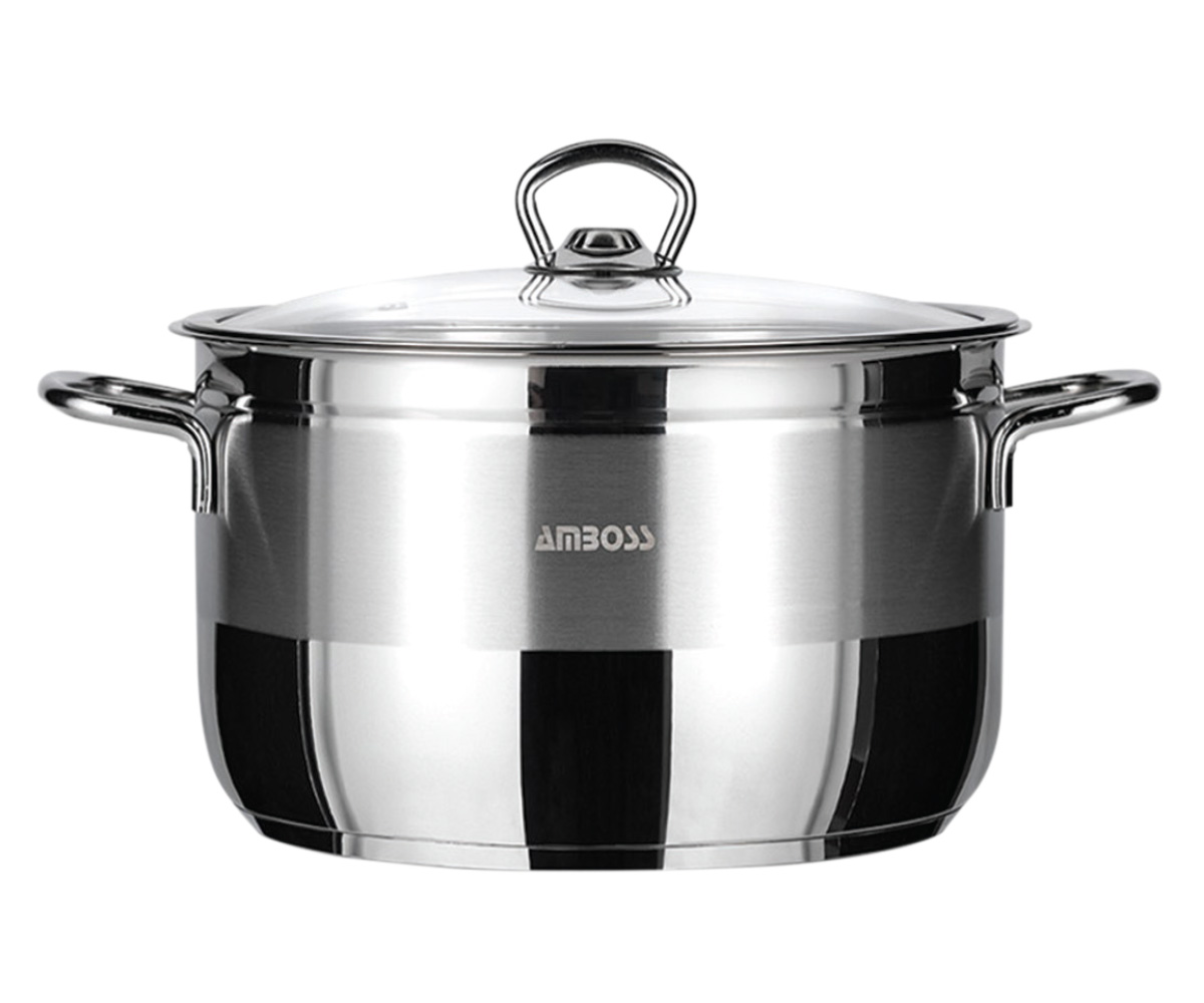 Βαθιά κατσαρόλα της εταιρείας Amboss, με διάμετρο 28εκ. και χωρητικότητα 11 λίτρα, η οποία μπορεί να καλύψει τις ανάγκες 6 ατόμων και άνω. Είναι κατασκευασμένη από ανοξείδωτο ατσάλι, ένα υλικό ιδιαίτερα ανθεκτικό σε υψηλές θερμοκρασίες, το οποίο θερμαίνεται πολύ γρήγορα και μπορεί να διατηρήσει τη θερμοκρασία για περισσότερη ώρα σε σχέση με τις κατσαρόλες αλουμινίου. Δεν διαθέτει αντικολλητική επίστρωση, γι'αυτό και στο μαγείρεμα χρειάζεται αρκετή ποσότητα λαδιού για να μην κολλήσει το φαγητό στον πάτο. Επιπλέον, είναι συμβατή με όλες τις εστίες (αερίου, κεραμικές, επαγωγικές, ηλεκτρικές).