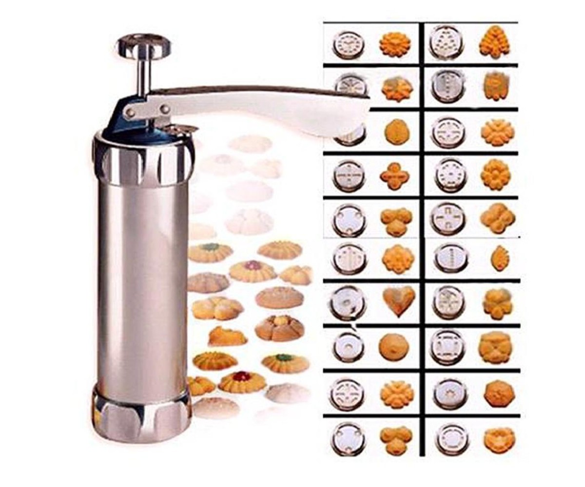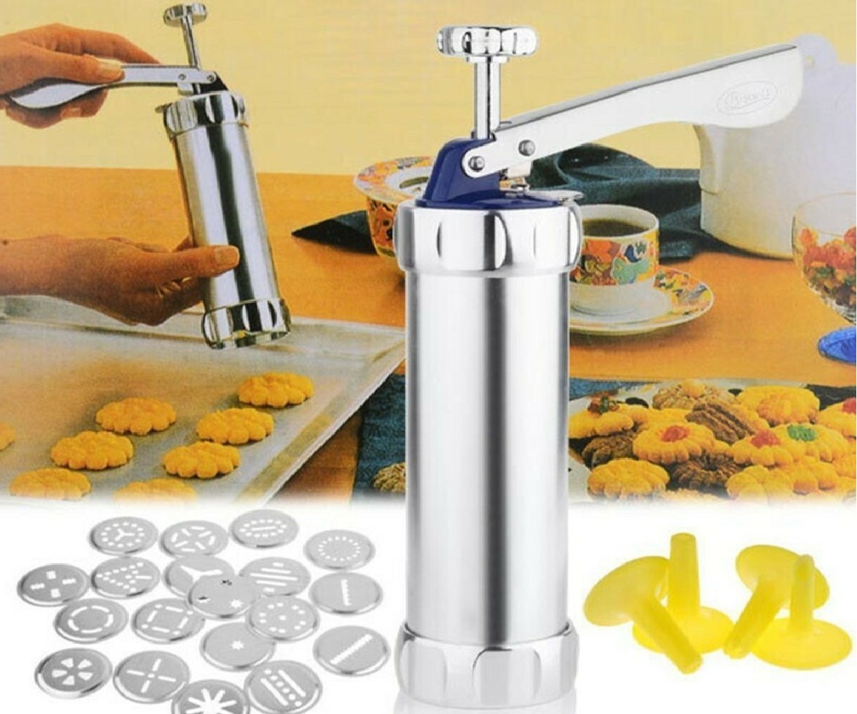 Μεταλλική μπισκοτομηχανή κατασκευασμένη από αλουμίνιο, η οποία περιλαμβάνει 20 διαφορετικές κεφαλές παραγωγής μπισκότων παρέχοντας πληθώρα σχημάτων. Έχει δύο σκάλες, μία για λεπτά και μία για πιο χοντρά μπισκότα.